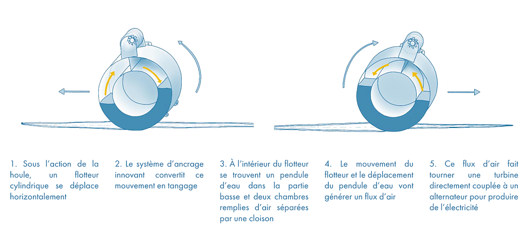 conversion : mouvement des vagues -> mouvement horizontal du flotteur -> tangage par le système d’ancrage -> déplacement du pendule d’eau -> génération du flux d’air -> actionnement de la turbine ;