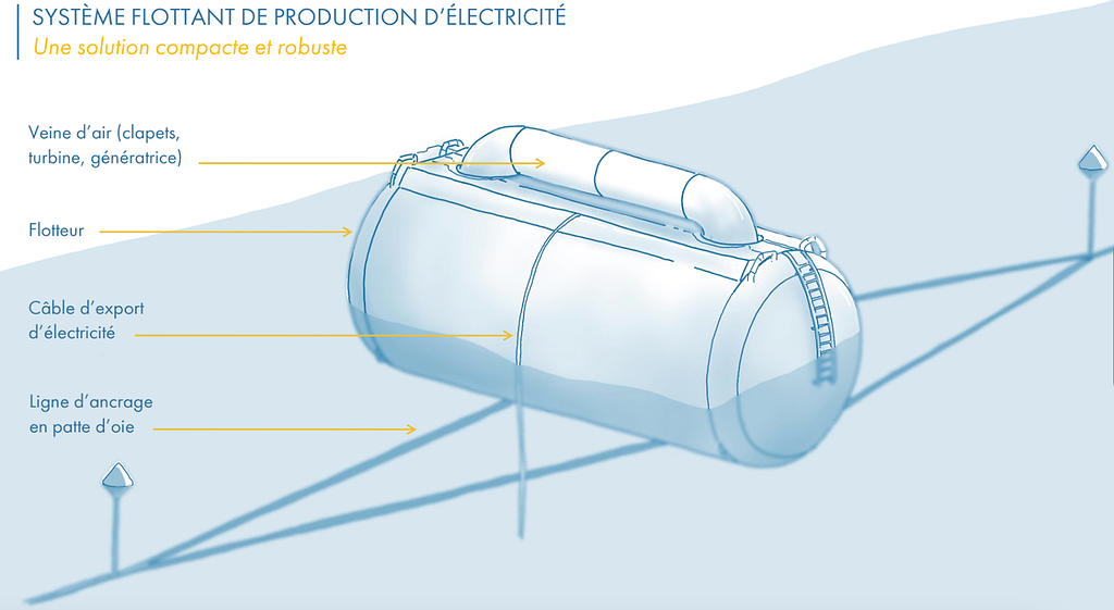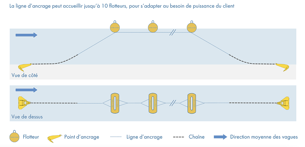 ligne d’ancrage : peut accueillir jusqu'à 10 flotteurs. Ainsi, plutôt que d’avoir 20 pour 10 cylindres, 2 suffisent à faire tenir l'ensemble limitant les coûts d’installation, de fabrication ainsi que l’impact sur les mammifères marins ;